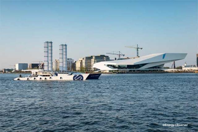 During Energy Observer’s stop in Amsterdam, our teams installed the 2 Oceanwings® wings on board Energy Observer. At 9am on Thursday the wings were arriving on the truck from CNIM’s workshops at La Seyne-sur-Mer. At 7pm the ship was sailing in front of the central station.